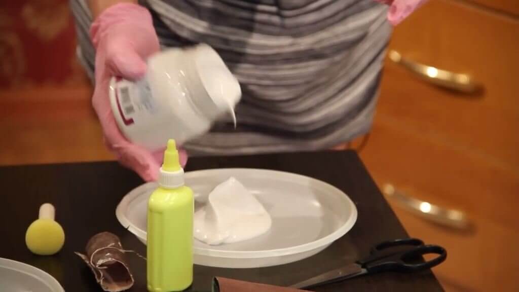 - Теперь в отдельной посуде разбавляем небольшое количество клея с водой в соотношении 2:3. Все приклеенные картинки тщательно покрываются приготовленным раствором, начиная от центра и двигаясь к краям. Имейте в виду, под картинкой не должен оставаться воздух.