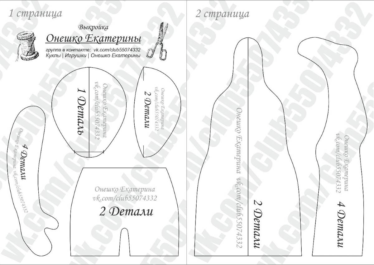 - выкройка, включающая в себя 4 детали рук, 2 детали ног, 2 детали туловища (можно сразу объединить с ногами и так вырезать), голова;