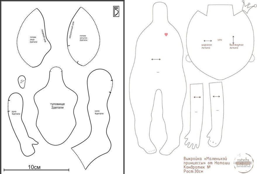 Если же вы поторопились раскроить и пошить одновременно все детали, но оказалось, что голова и туловище не подходят друг другу по размеру, не отчаивайтесь. Сделайте выкройку соответствующей длины и смастерите 2 куклы, добавив одной новое пропорциональное туловище, а другой — голову.