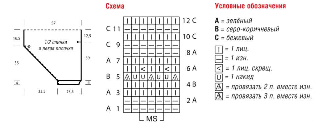 - Перед и спинка вывязываются в форме трапеции, придерживаясь схемы.