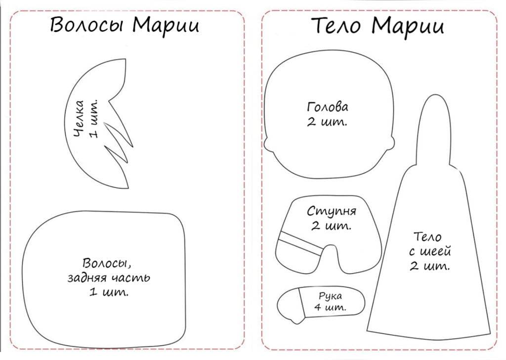 - Мария. Распечатайте шаблоны на бумаге и перенесите на фетр. Вырежьте детали и ровными стежками сшейте между собой.