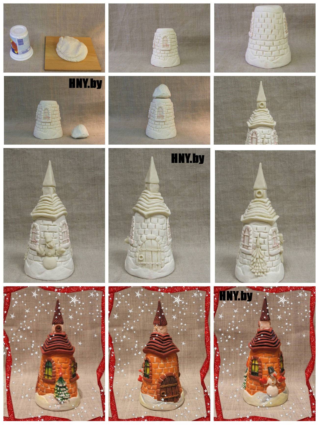 Когда тесто готово, можно приступать к работе. Повернув баночку вверх дном, ее облепляют тестом. После того, как основа готова, стеком наносят рисунок – кирпичную кладку. Полученную конструкцию оставляют на время, чтобы она хорошенька просохла. Затем приступают к изготовлению крыши. Из бумаги формируют каркас, закрепив его скотчем. Крышу помещают сверху на стаканчик. При помощи кусочков теста придают ей нужную форму. Теперь можно украсить дом. Из теста делают окна, дверь, сугробы у основания домика, снеговика, елочку. Детали к хорошо просохшей конструкции можно прилепить, смочив их обычной водой. Наконец можно раскрасить домик гуашью или акрилом.