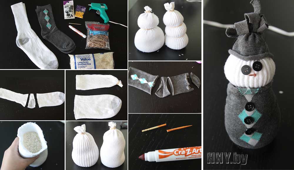 Изготовление абсолютно простое — носки отрезаются до самой пятки, затем низ сшивается и наполняется рисом. Туловище снеговика перевязывается нитками, а в заключении оформляется личико. Игрушка одевается по собственному усмотрению. В качестве декора используются разные аксессуары.