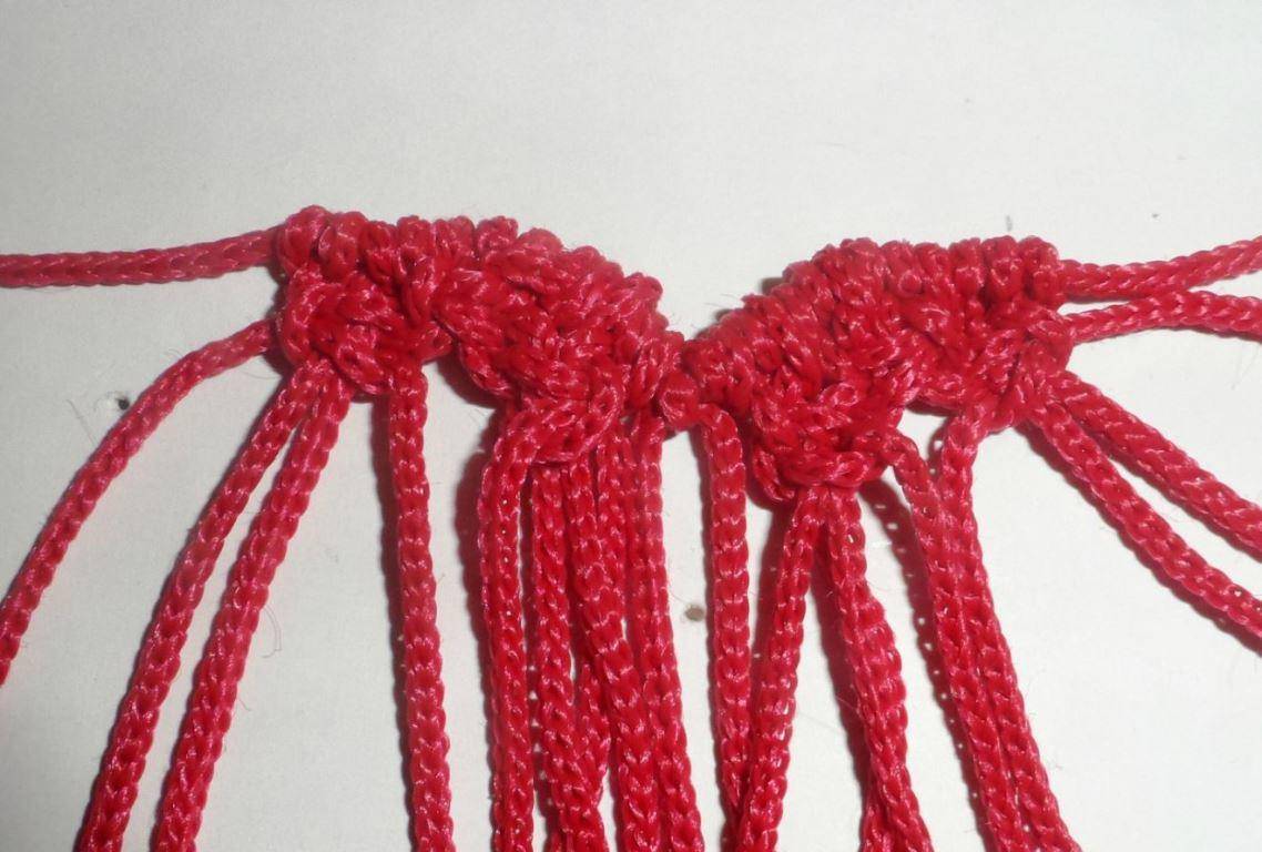 - Возьмите первые 4 нити с лева (отсчет начинается от крайней нити выходящей из первого столбика, завязанного в пункте 2) отступите от верхнего столбика из квадратных узлов 1,2 см и свяжите эти нити в столбик состоящий из двух квадратных узлов.