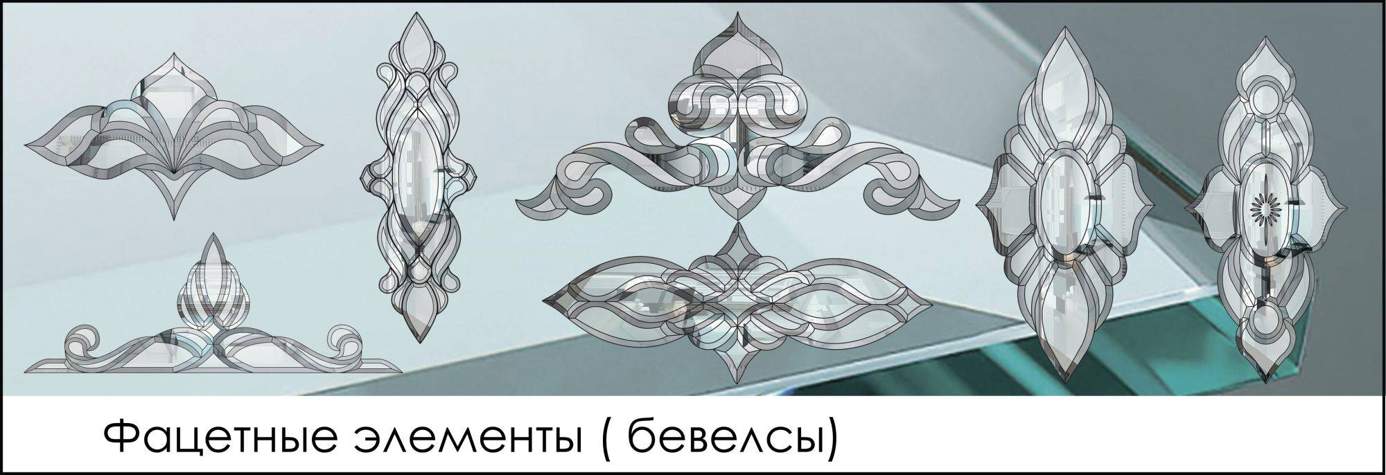 Базовым элементом фацетного витража являются граненые стеклянные кусочки. Элементы, которые называют bevels (бевели или бевелсы), делают из плоского стекла с толщиной 5 мм по шаблону. Чтобы получить скос на отрезанном и отполированном крае, снимают кромку размером до 1,5 мм под углом, отличным от 90°. Поэтапно производят черновую обработку, сглаживание, полировку. Такая кромка надежно соединяет отдельные фацеты металлической витражной полосой.
