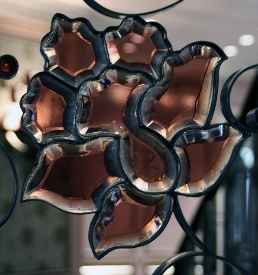 - Фацеты удерживаются вместе металлическим профилем. Металлы используются из-за гибкости и адаптивности, которые необходимы для окантовки различных форм стеклянных деталей. После сборки каждое свинцовое или медное соединение припаивается вручную по обеим сторонам панели.