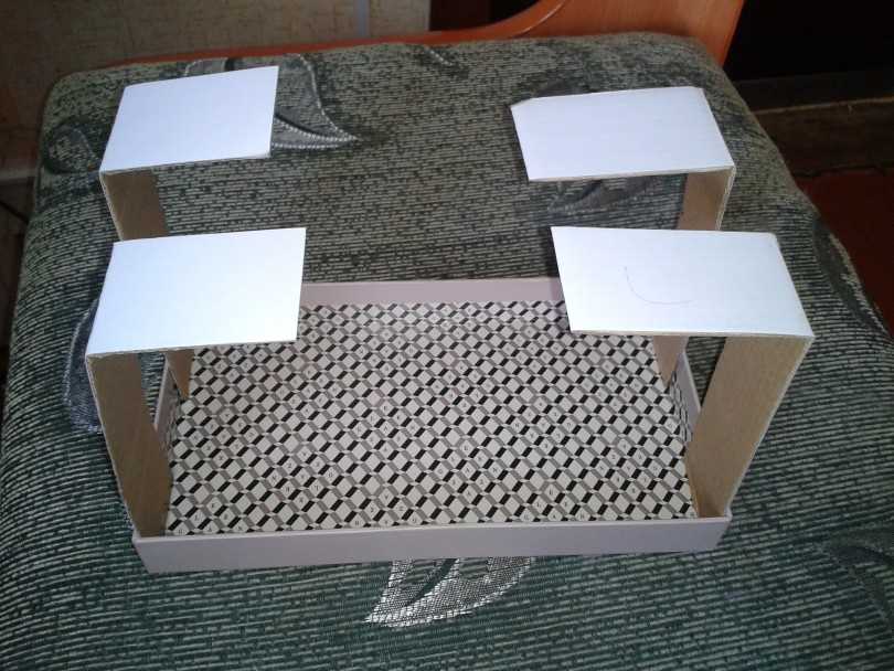 Этот вариант можно сделать буквально за 10-20 минут. Тут не нужен клей или другие фиксаторы. Детали держатся за счет пазов, вырезанных в картоне. Ширина паза равна толщине картона, длина прорезей и размеры заготовок указаны на схеме.
