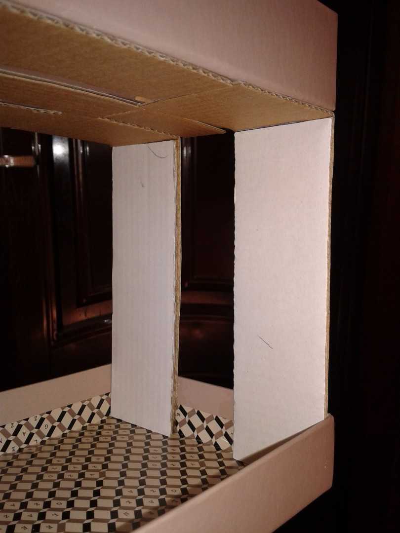 Самый дешевый материал, но больше всего подлежит деформации. Самым твердым является картон для хобби. Закрепляют клеем.Чтоб дом оказался более крепким, лучше сделать каркас из планок, а затем затянуть картоном.