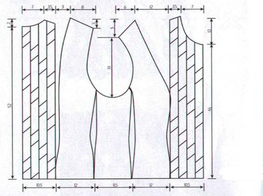 Через эти уровни проводим горизонтальные прямые до пересечения с вертикальными линиями, ограничивающими ширину спины. Между точками пересечения выделяем отрезки, определяющие прорези для рук.