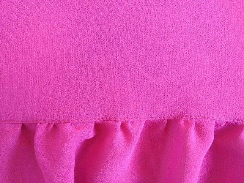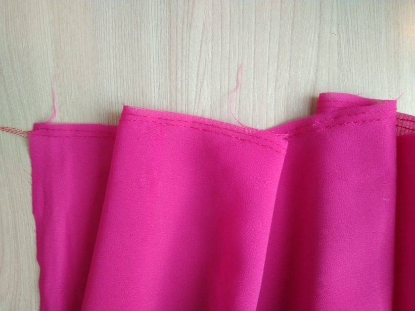 - Сложите детали переда и спинки лицевыми сторонами внутрь, стачайте и обработайте плечевые швы. Из-за рюша деталь переда немного короче детали спинки. Поэтому лишнюю ткань на спинке нужно срезать.