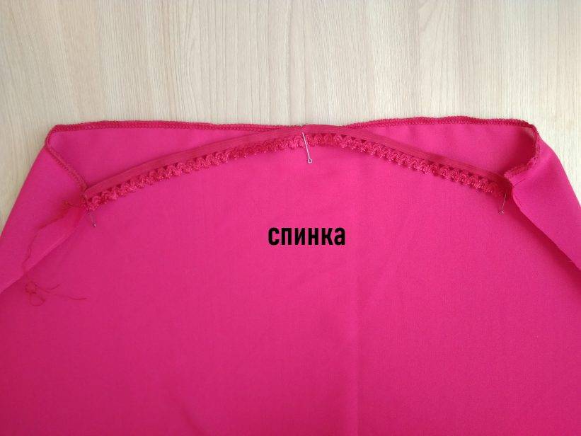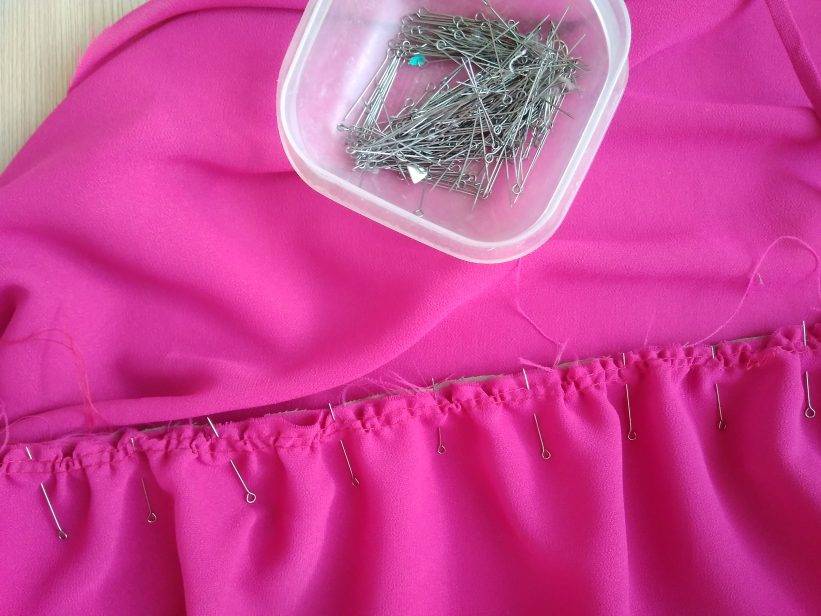 - Прокладываем по краю горловины машинную строчку, равномерно распределяя по контуру собранную ткань. Для этого мы использовали портновские булавки.