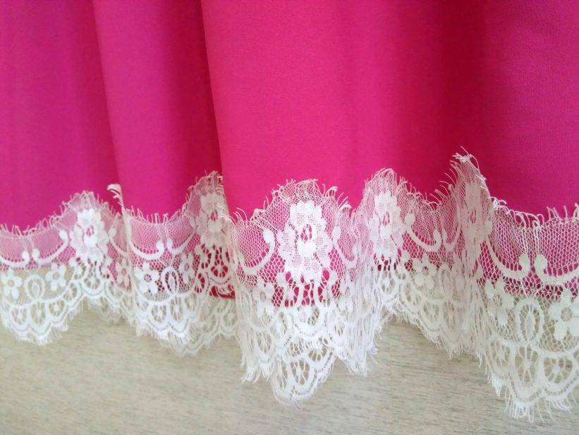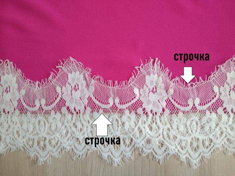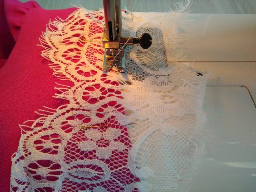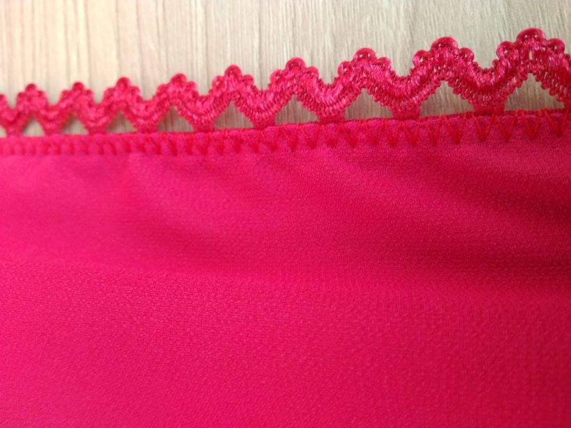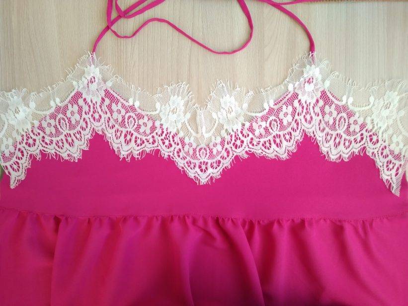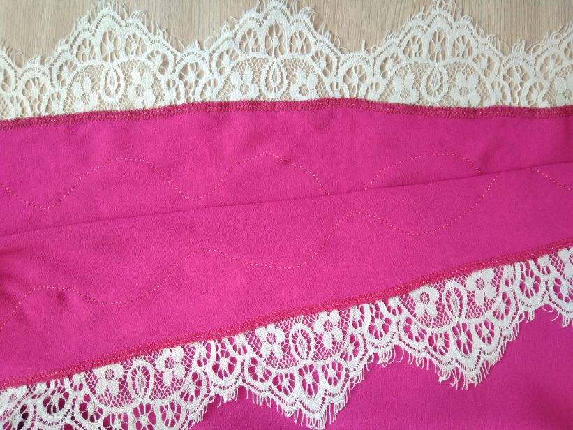 - Для отделки горловины используем остатки кружева. Сшиваем его края и прикрепляем отрез по краю горловины. Так мы получили воланы.