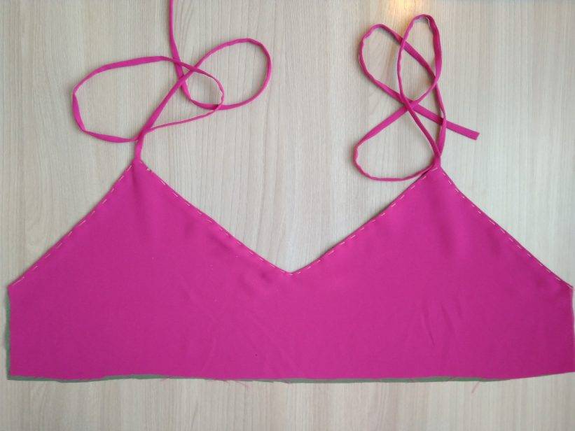 - Вырезаем длинные тканевые отрезки по косой из имеющихся остатков материала. Натягиваем слегка кант при его пришивании, чтобы получить опрятный край горловины.