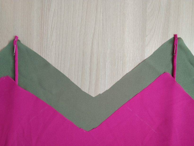 При помощи булавок прикалываем обтачку (нижние срезы) к горловине ночной рубашки (к лицевой стороне).