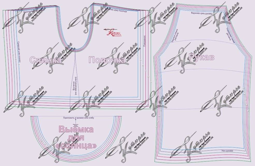 разделите верхнюю часть половины спинки и половины переда на три равных отрезка, и отпустите перпендикуляры вниз. Тоже самое сделайте с рукавом (как на рисунке).