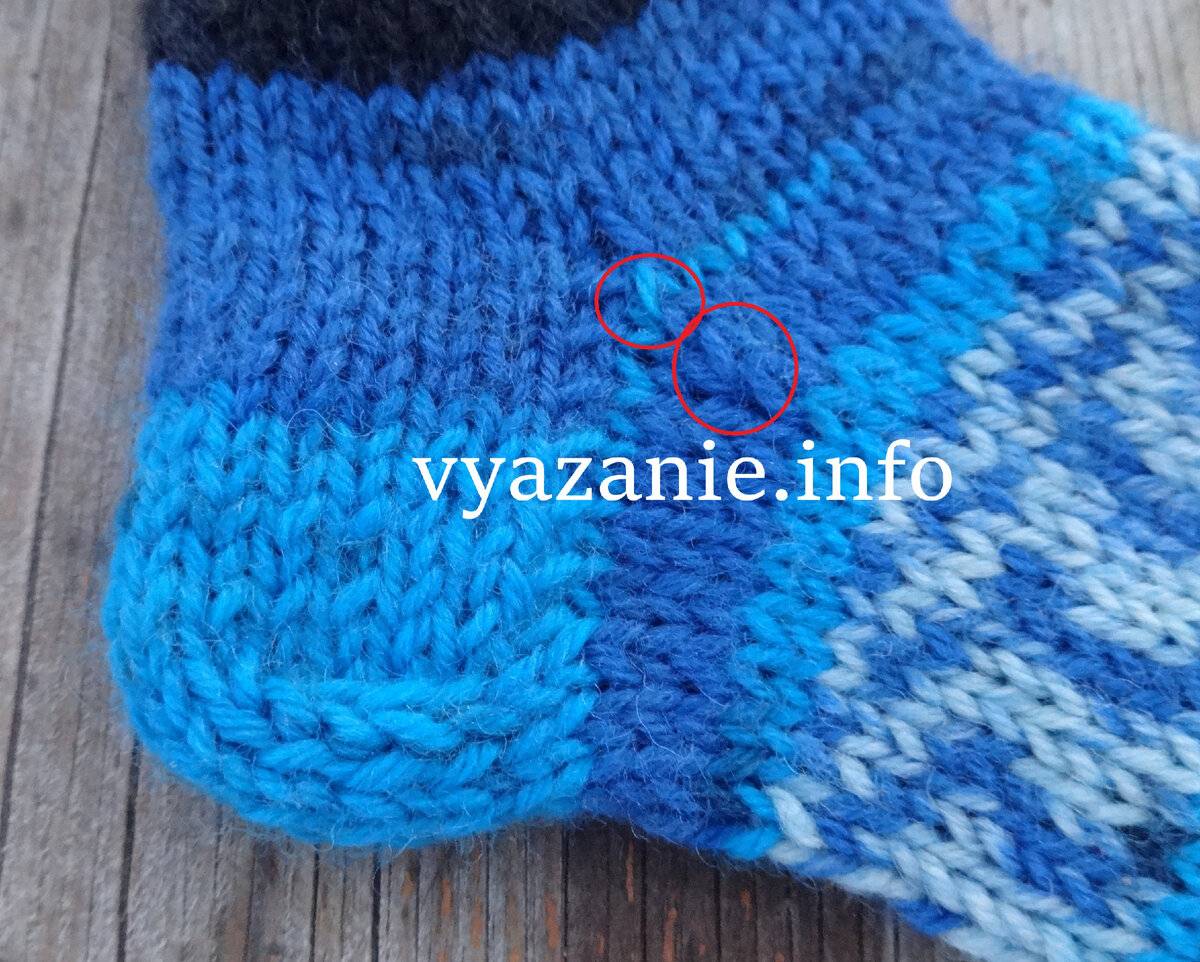 При вывязывании пяток нужно следить за тем, чтобы у 2-х полотен они располагались с разных сторон. Если для вывязывания пятки выбрать среднюю часть, то шов получится спереди.