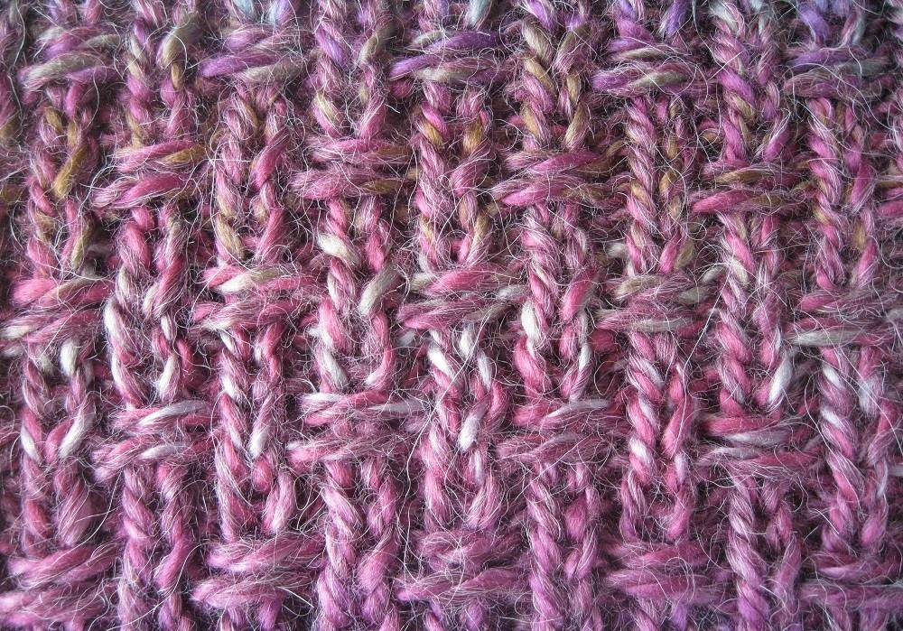 Переходим на большие спицы и вывязываем полотно, чередуя пряжу и схемы как описано выше, прибавив с равными интервалами в 1-ом р. 6 петель. Получаем в работе 50 петель.