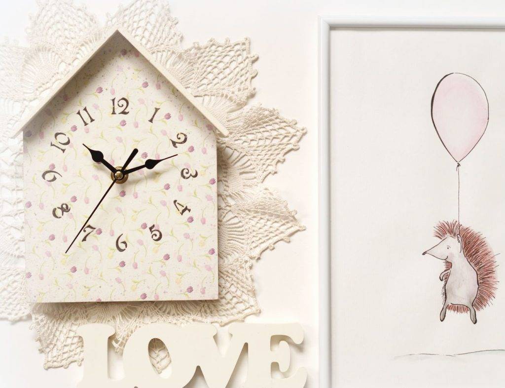 Далее крепится сам механизм часов. Прямо по центру циферблата нужно сделать небольшое по размеру отверстие, а с другой стороны нужно приделать механизм так, чтобы крепление для стрелок оказалось прямо по центру циферблата Ваших часов. Для закрепления механизма вырежьте круг из картонного листа, древесины. Диаметр его должен быть одинаковым с пяльцами. К нему приклеивается механизм. Также можете попросту подвесить его на ленточку, которая крепится к пяльцам. Рекомендуем сделать петлю, чтобы Вы могли подвесить на стенку аксессуар. Осталось привинтить стрелки и вуаля! Смотрите варианты подобных предметов на наших фото настенных часов своими руками.