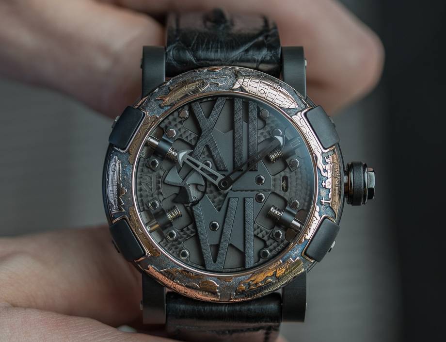 В коллекции Romain Jerome есть модель с «говорящим» названием RJ Steampunk. На циферблате размещен корабельный гребной винт и четыре крупных стальных болта, которые держат обод. В одном из вариантов этой модели на ранте часов выгравирована техника викторианской эпохи: дирижабль, субмарина, паровоз.
