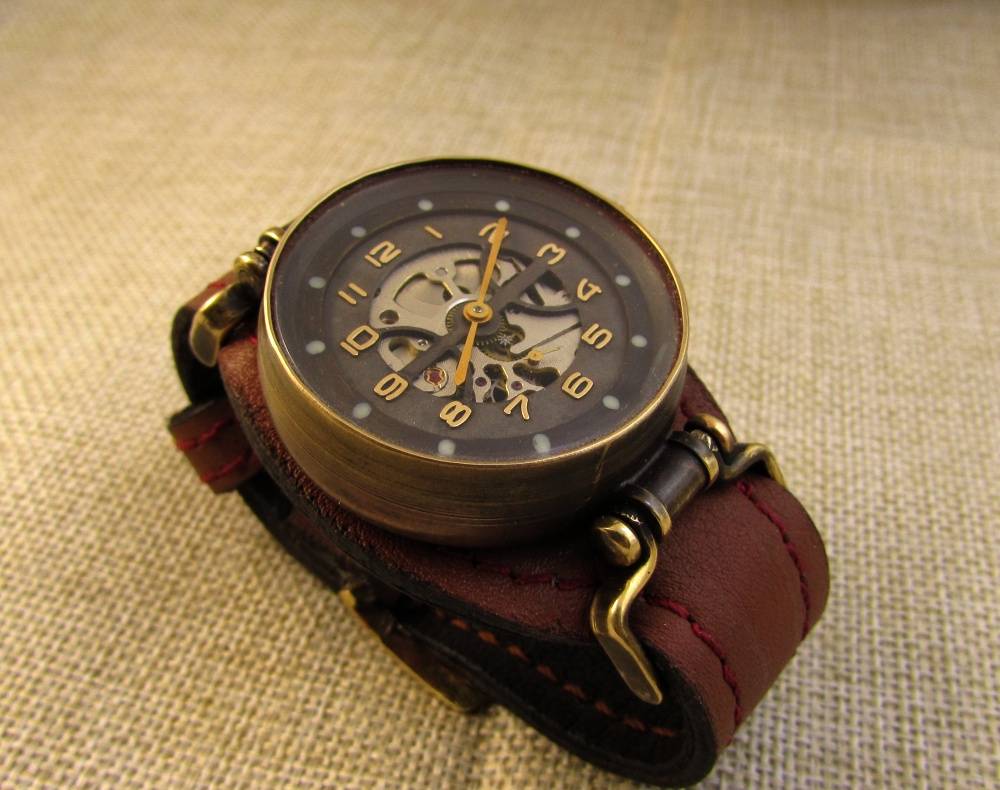 Потрясающий образец стиля — часы Devon Steampunk Tread 1. Их стальной корпус-скелетон с бронзовым покрытием открывает взору работу филигранного механизма.
