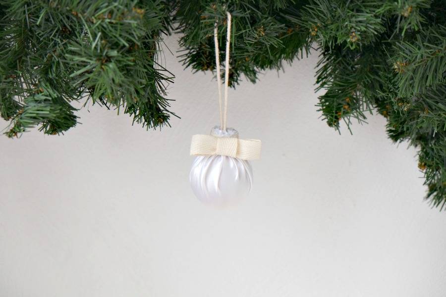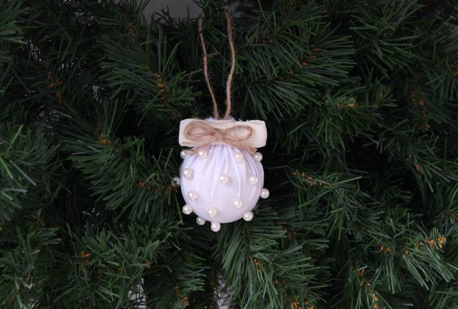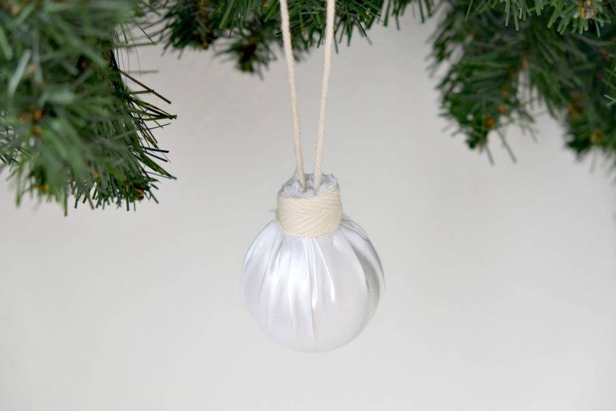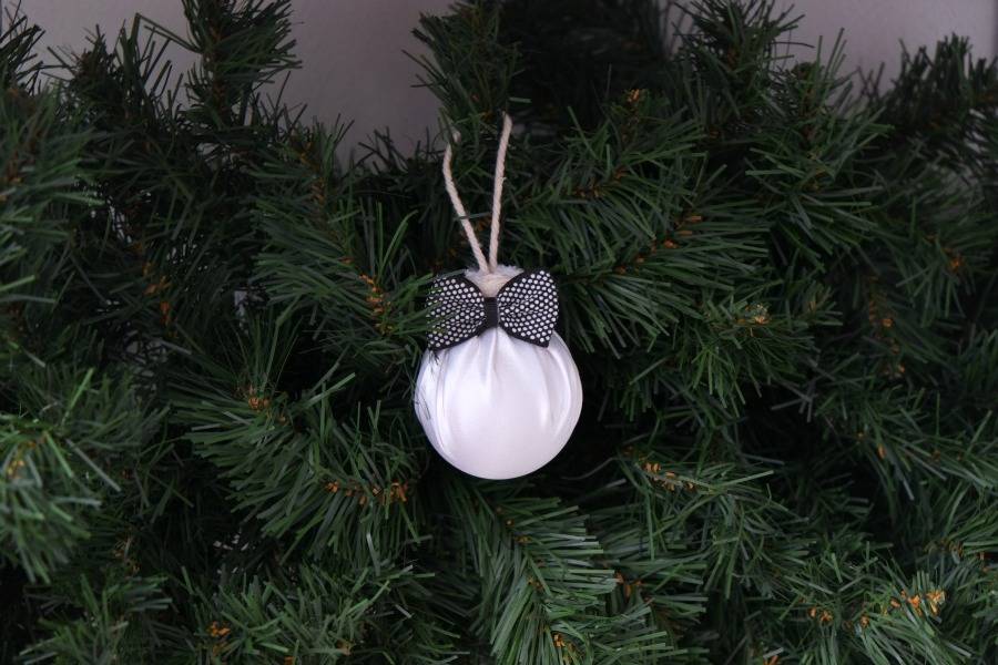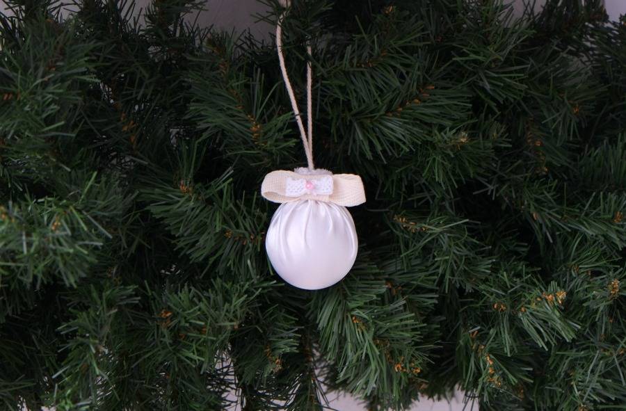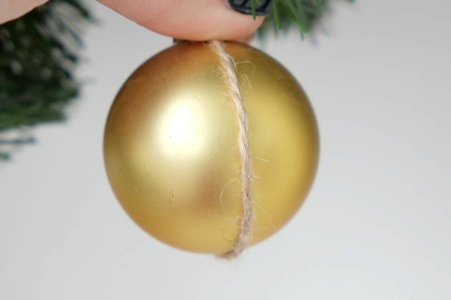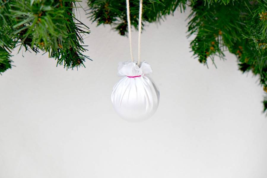 5. Помещаем елочный шар в середину, затягиваем и завязываем концы нитей.