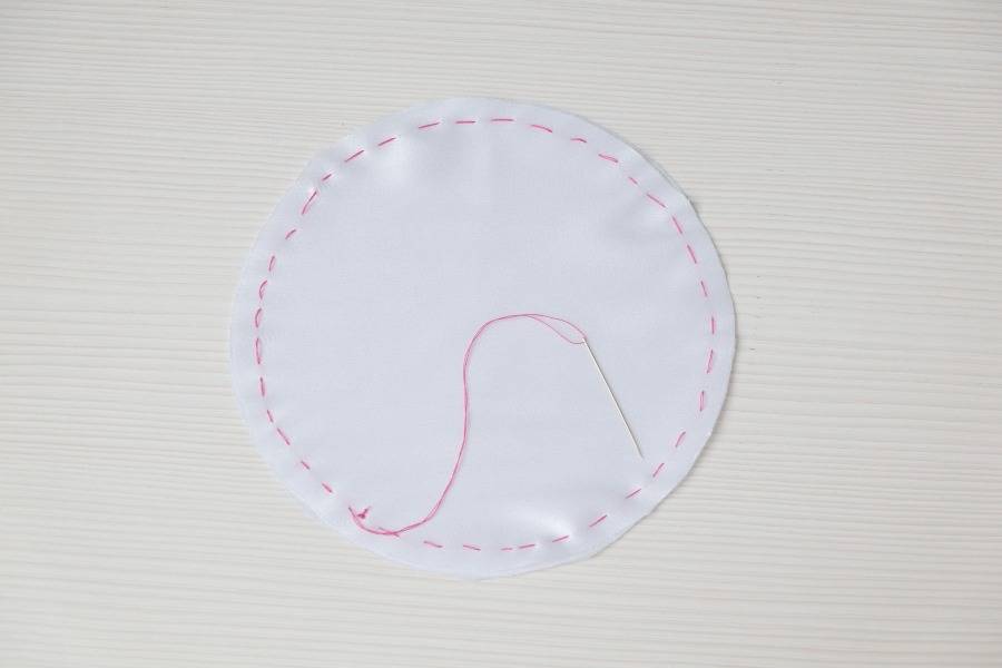 4. Берем нитку с иголкой и делаем пунктирный шов по краю ткани. На этом этапе хорошо поменять тесьму для подвешивания шара на елку.