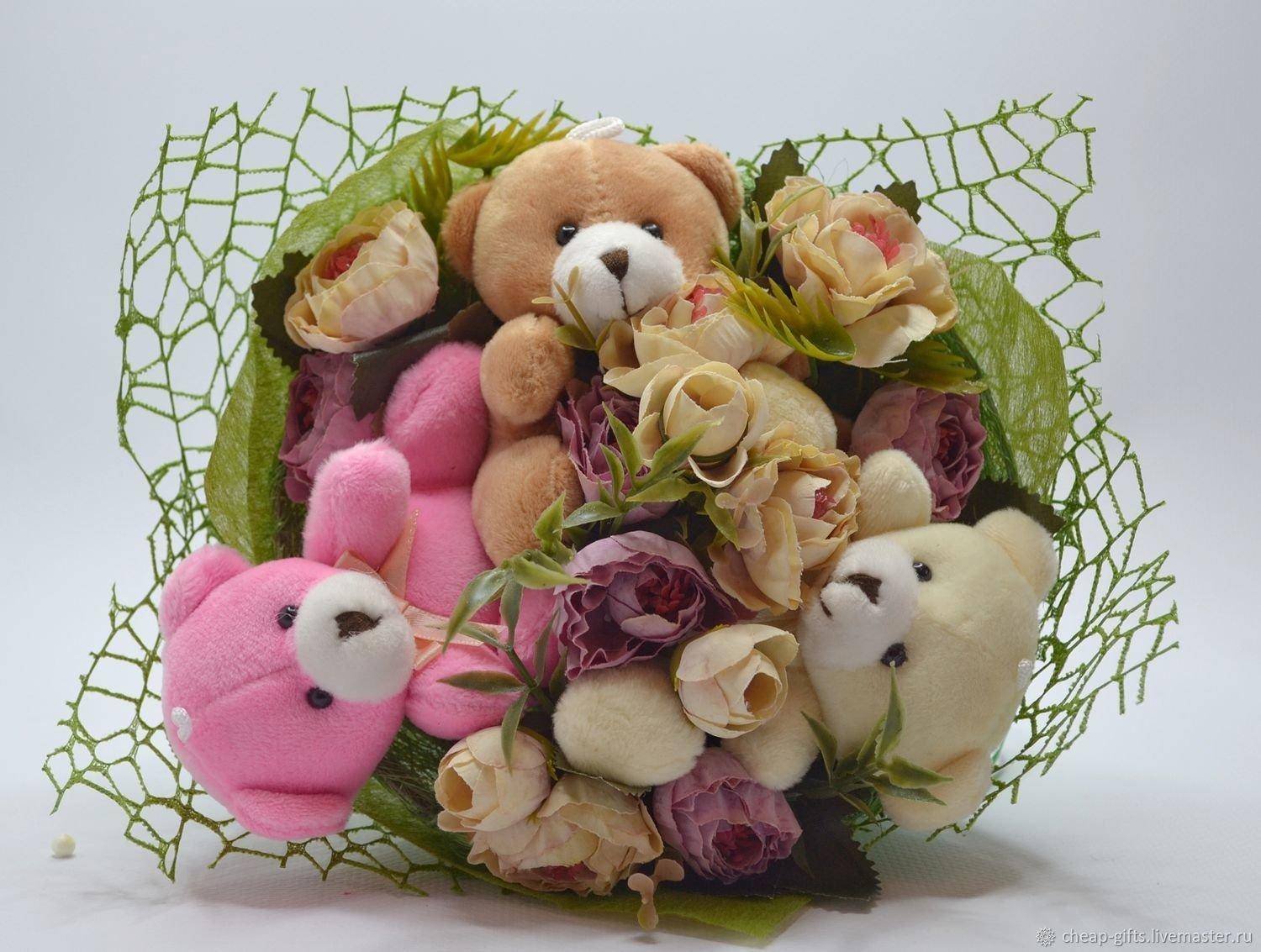 Можете дополнить мягкий букет вкусными конфетами. Такой подарок точно понравится даже самым маленьким гостям.
