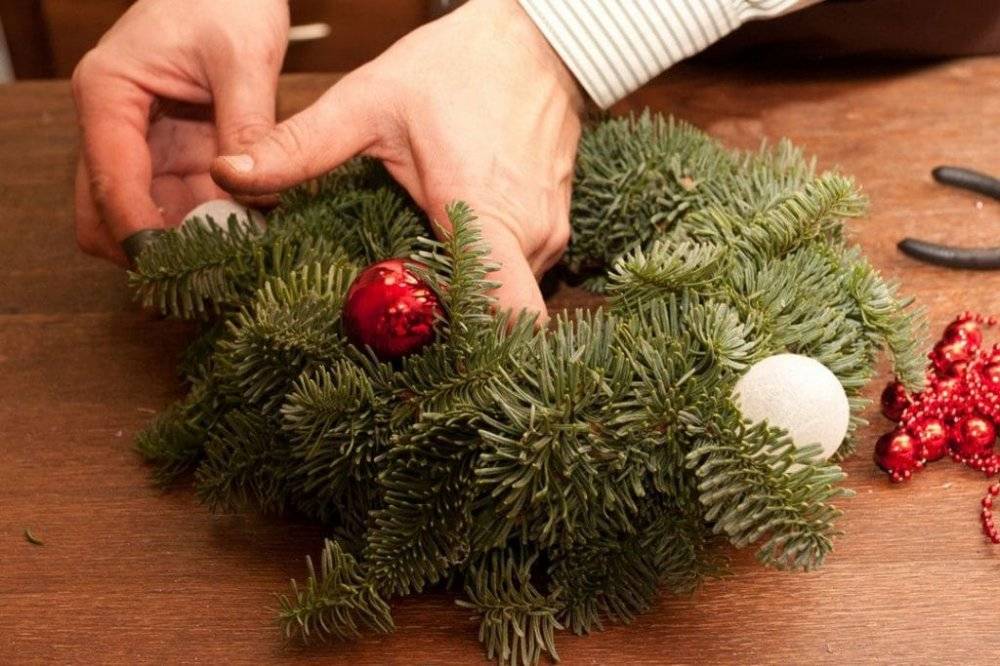 Когда основа из еловых веток готова нужно приступить к украшению венка. Можно оставить его и просто так он и сам по себе выглядит необычно. Но чтобы его образ был по-настоящему праздничным нужно добавить ярких цветов. Также можно приклеить еловые шарики маленького диаметра.