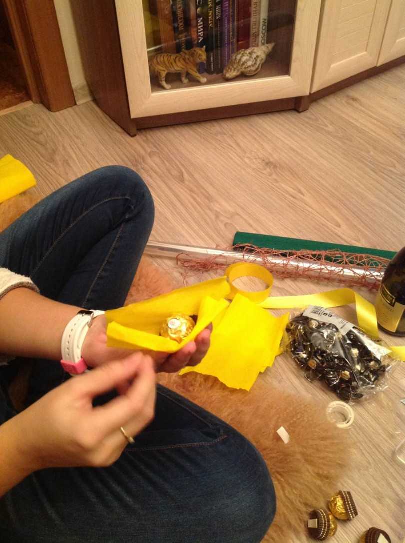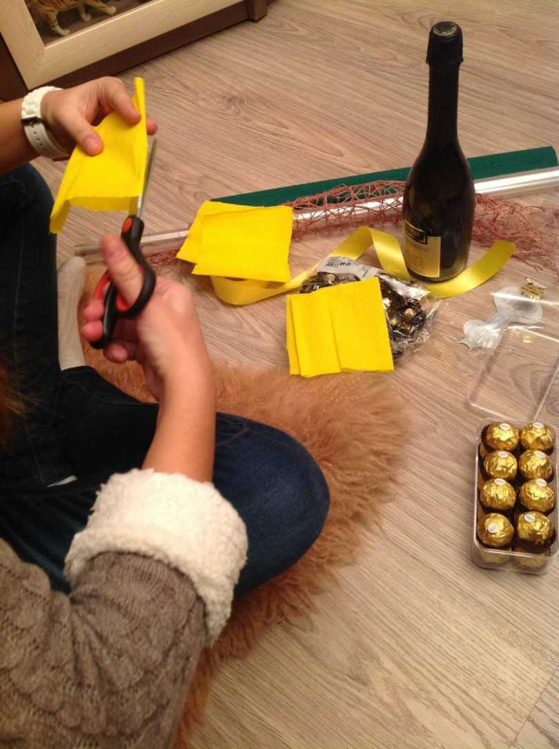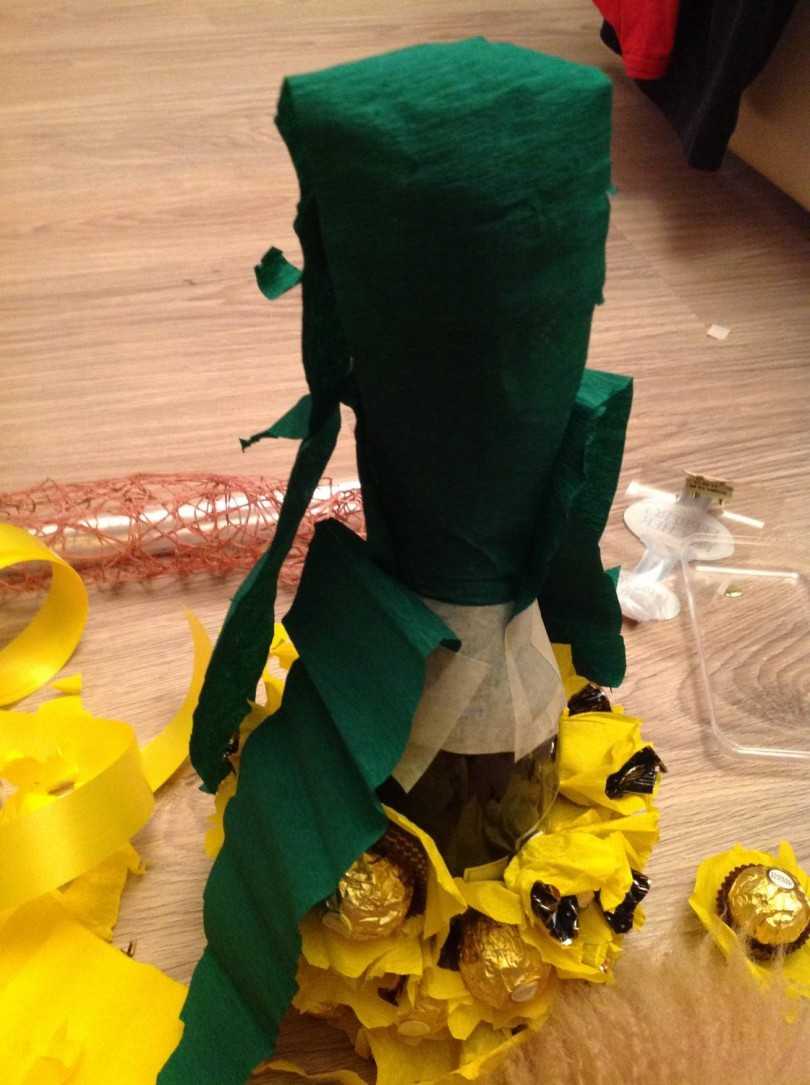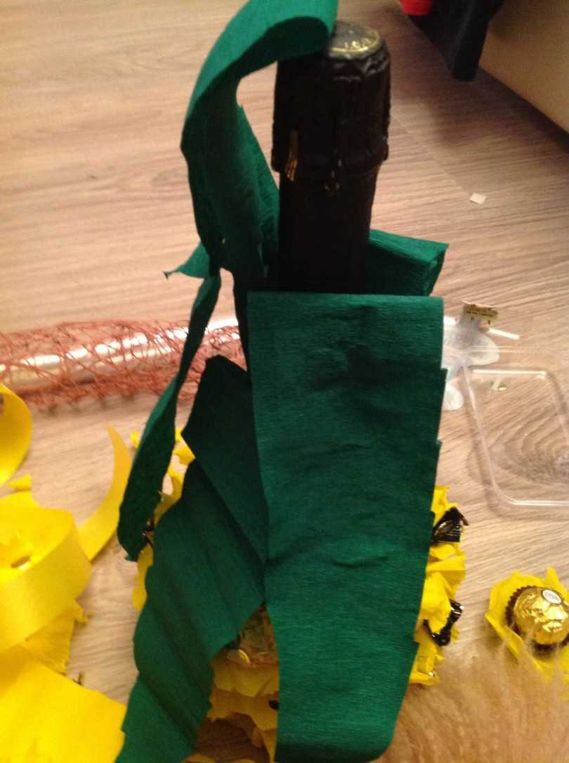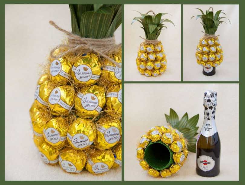 Придать шампанскому в виде ананаса из конфет завершенный облик поможет упаковка, которую также следует сделать своими руками.