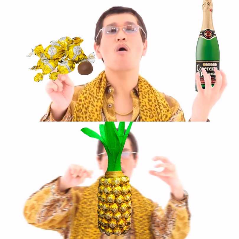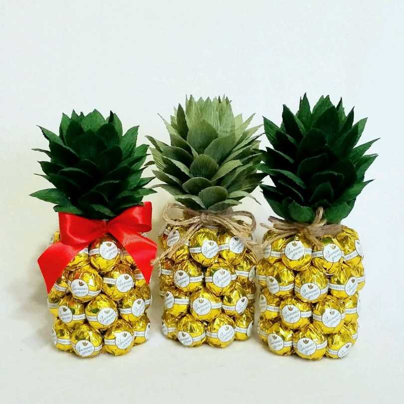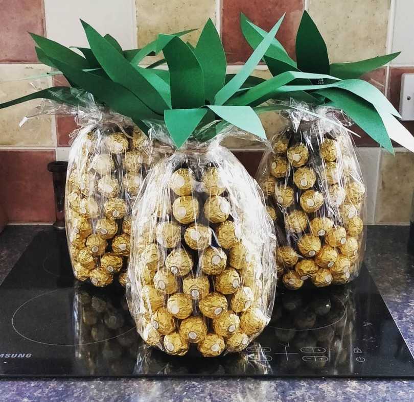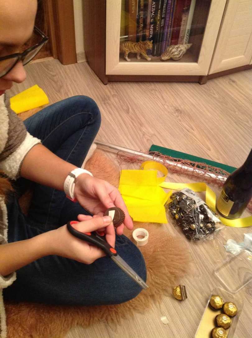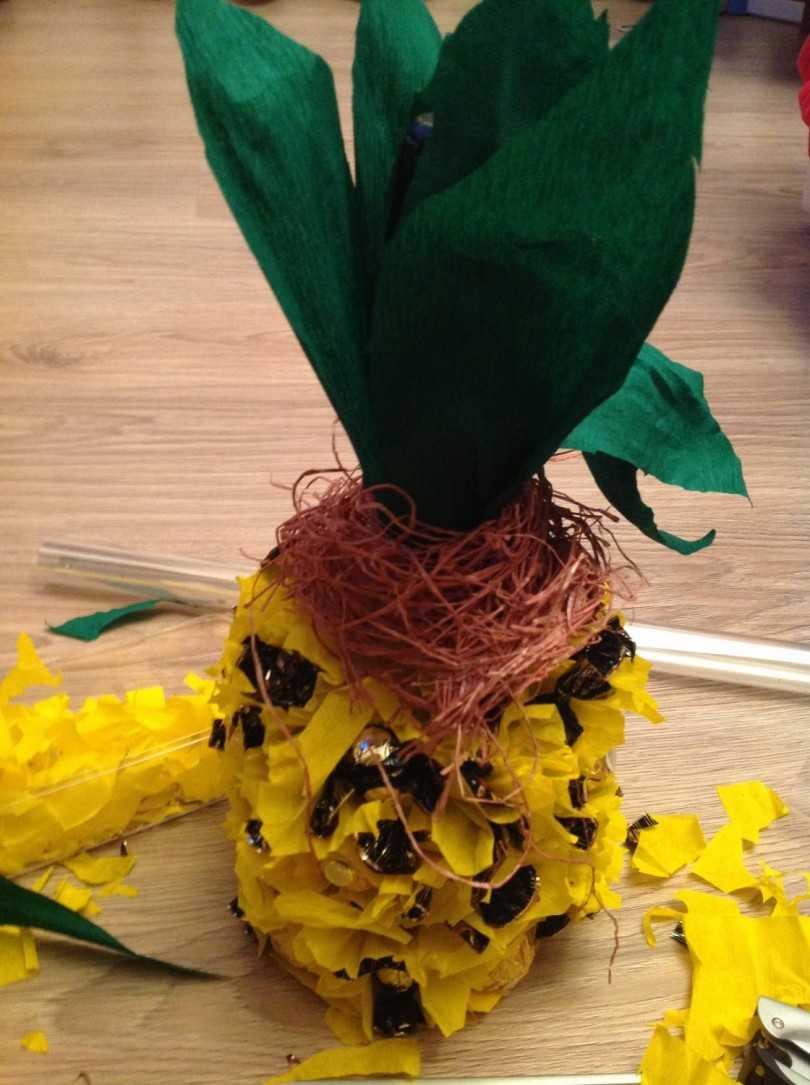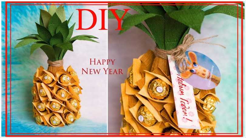 Придать шампанскому в виде ананаса из конфет завершенный облик поможет упаковка, которую также следует сделать своими руками.