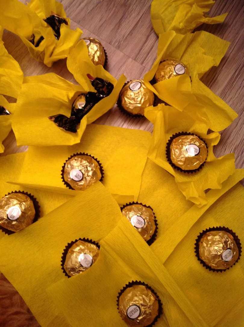 «Рафаэлло» можно заменить конфетами Ferrero Rocher, а листики вырезать из бумаги зеленого цвета.