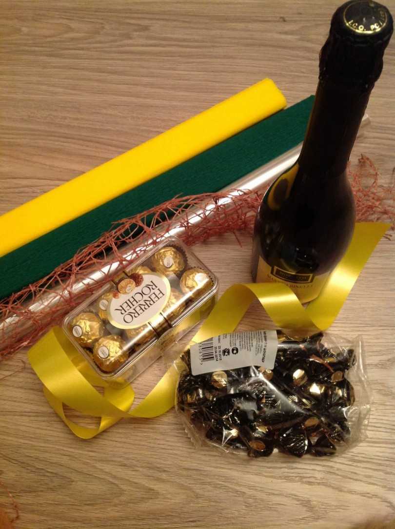 Букет из шампанского и конфет готов! Его можно задекорировать бантом или вложить милое послание.
