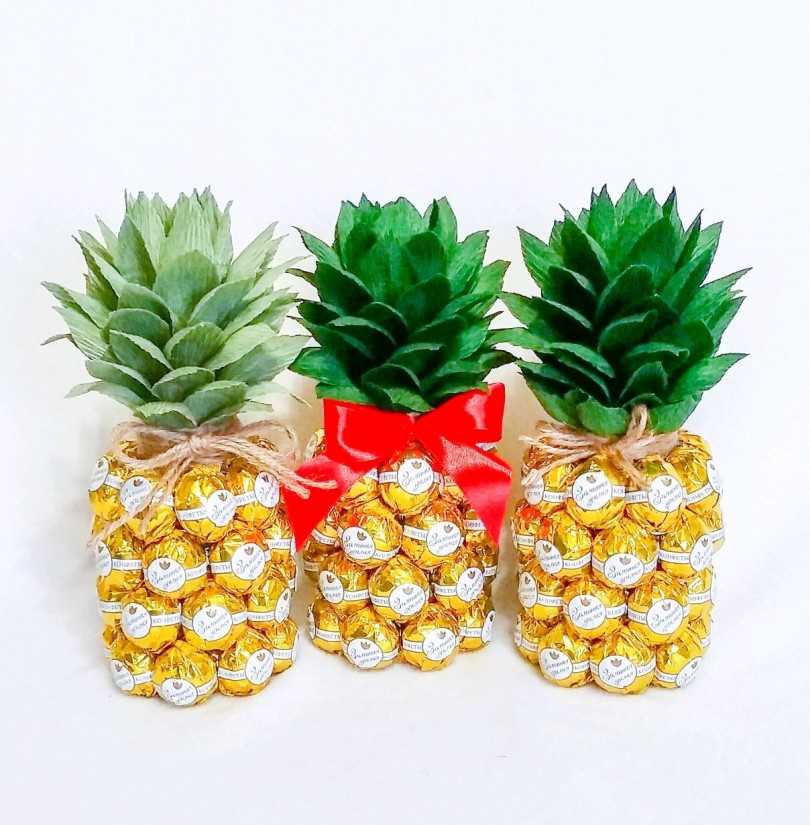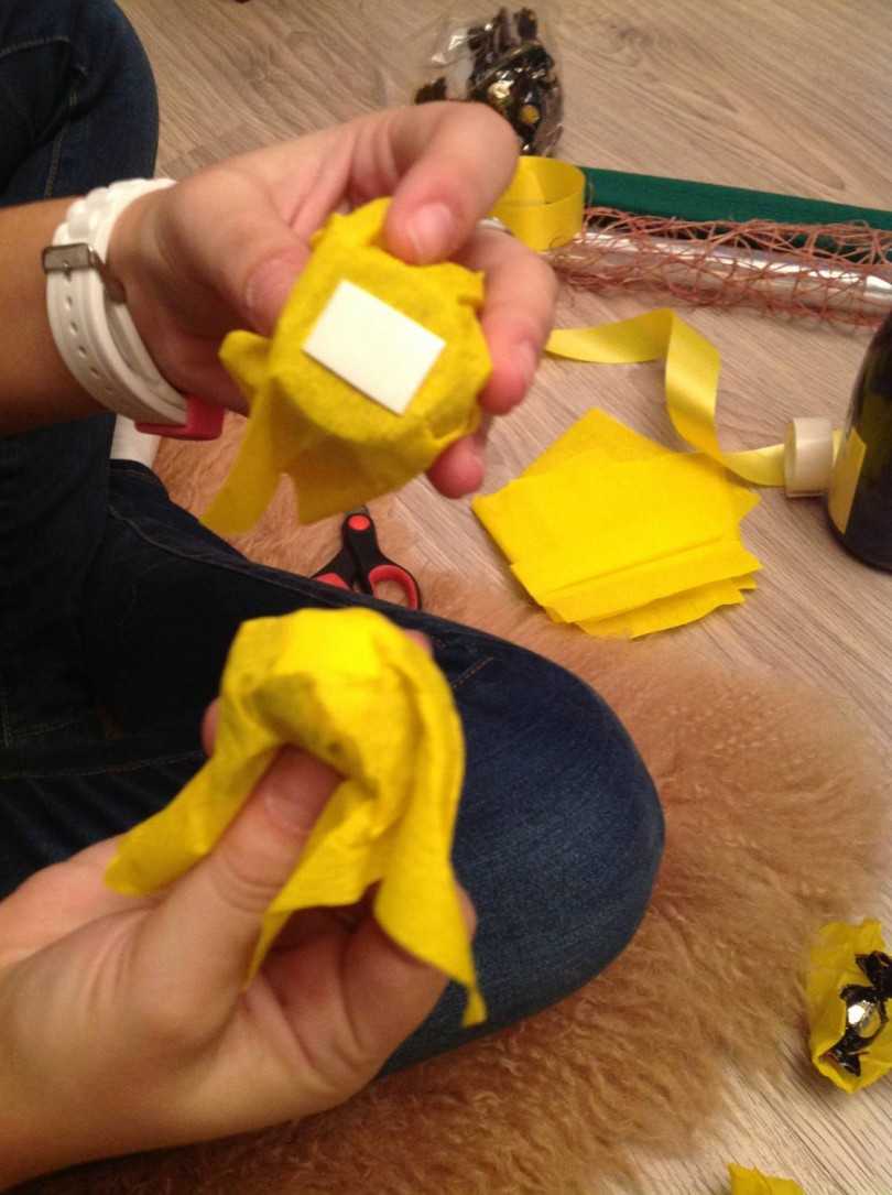 Далее приступим к подготовке сладких ингредиентов. Хвостики оберток скрепляем между собой. Сделать это можно с помощью клейкой ленты, нитки или клея. После этого начинаем создавать ананас из конфет. Для этого берем двусторонний скотч, режем на небольшие кусочки 1,5×1,5 см. Снимаем бумагу только с одной стороны и прикрепляем квадратик к скрепленным кончикам фантика, это позволит в дальнейшем с легкостью взять сладость.