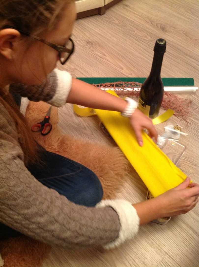 Изготовление такой бутылки своими руками не отнимет много времени.