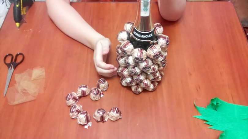 Между сладостями помещаем волокна сизаля, для лучшего соответствия поделки экзотическому фрукту. Второй ряд размещаем близко к первому в шахматном порядке, максимально используя пространство, и так продолжаем обклеивать конфетами шампанское до «плечиков» бутылки.