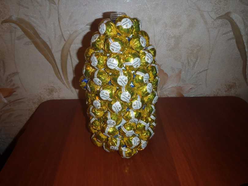 - Теперь берем конфеты и по кругу приклеиваем к бутылке практически до самого горлышка, как на фото.