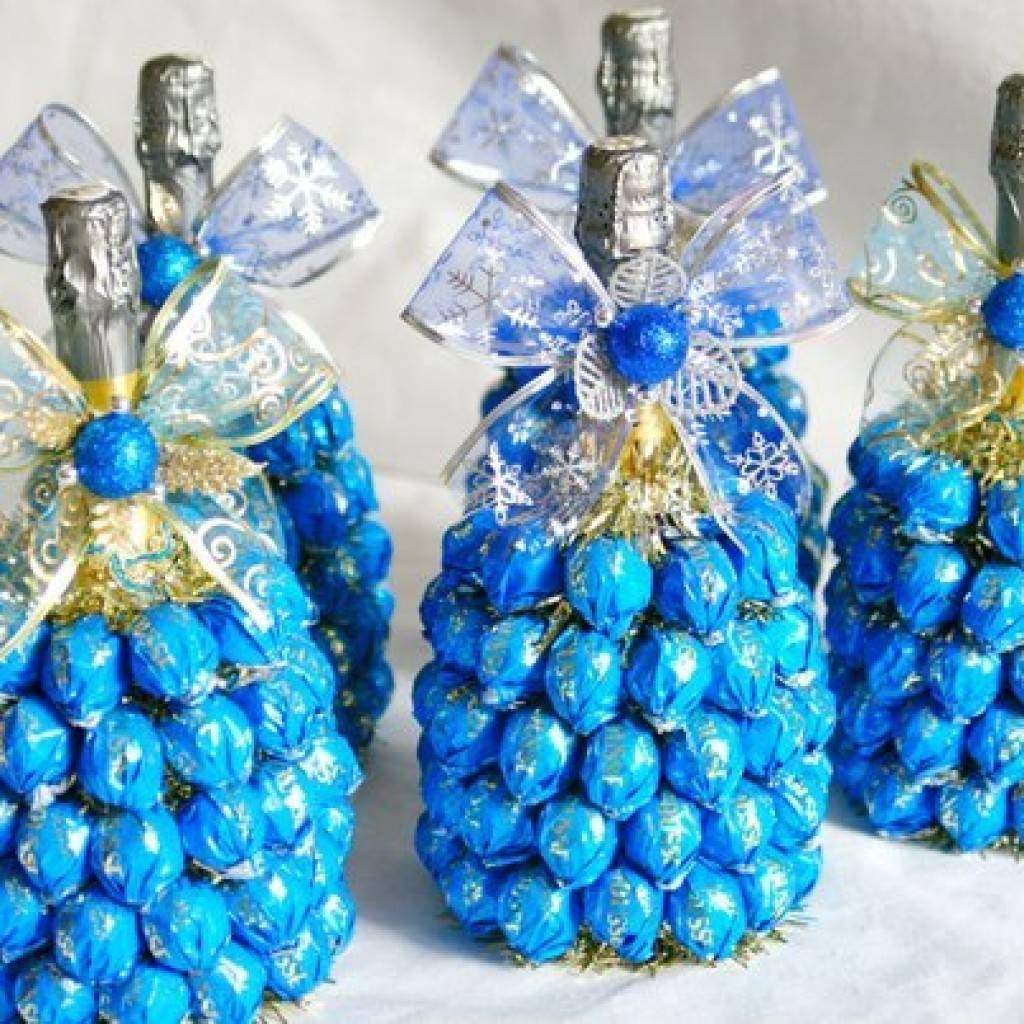 Отдельно можно вынести украшение бутылок с помощью конфет и других съедобных лакомств. Это не является декупажем в прямом понимании, но выглядит не менее эффектно и празднично.