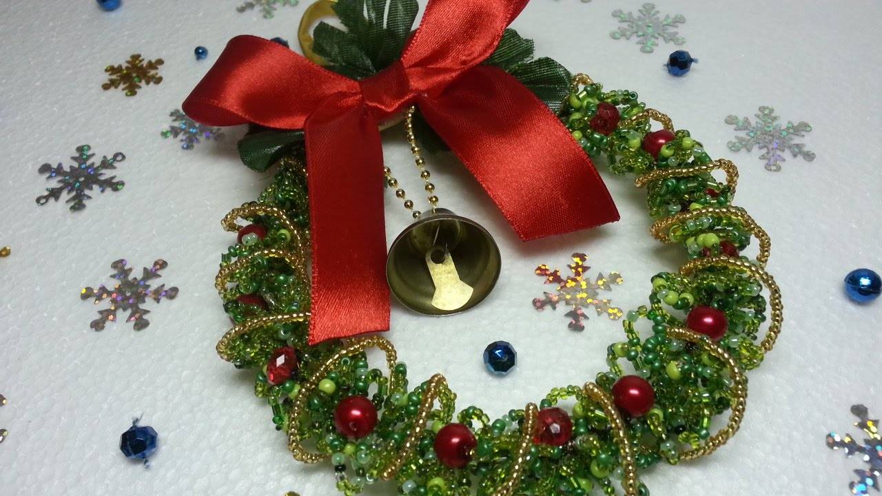 - Далее обматывают проволокой венок по кругу между иголками. Дойдя до места, где будет красоваться игрушка, надевают на проволоку большую бусину. Продолжают обмотку. Такие действия выполняют до конца венка. Должны быть прикреплены все бусинки.