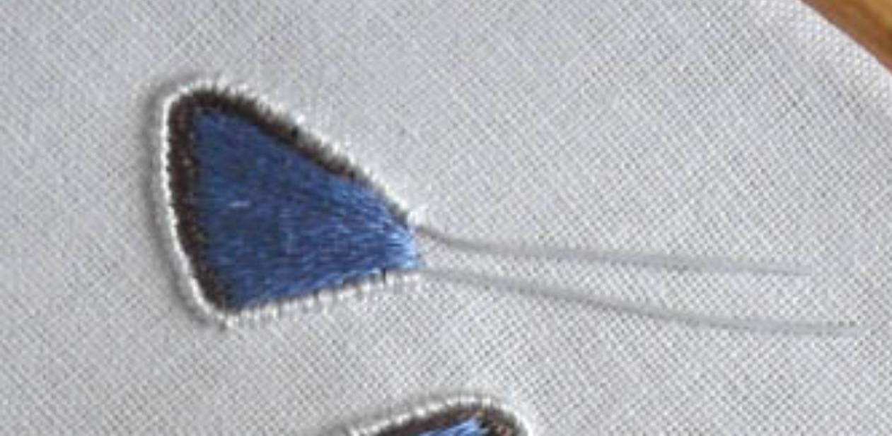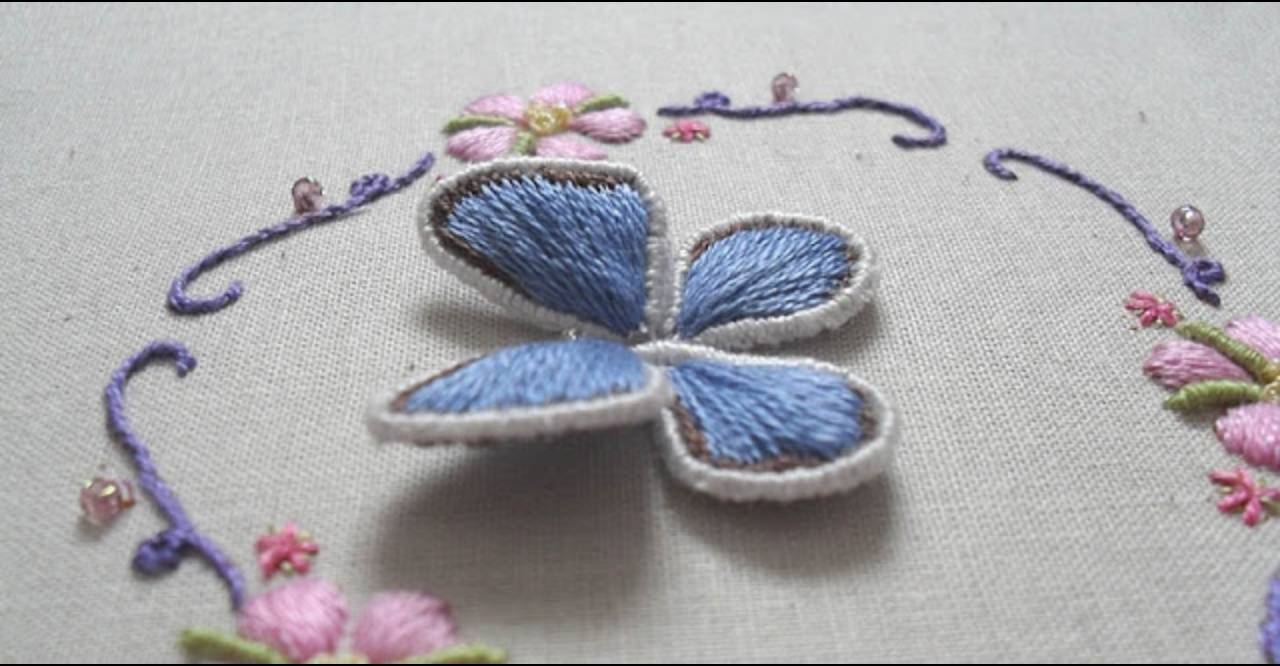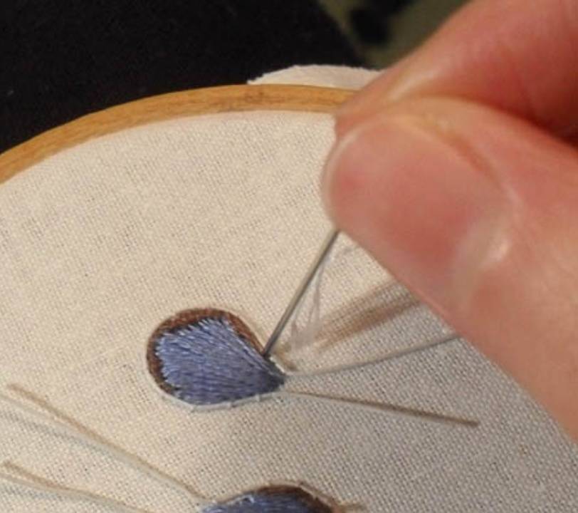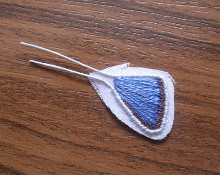 Такая тонкая проволока применяется в самом начале работы, когда ее крепят к краю лепестков или листиков, а возможно даже и крыльев бабочки. Для крепления используется стежок глади, который одновременно закрепляет проволоку, и создает объем элемента.