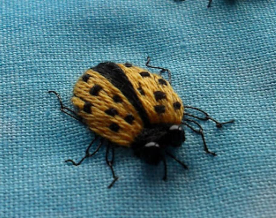 Несмотря на то, что выполнение представляется сложным, вышить насекомых довольно легко. Сперва следует подготовить все необходимое. Ткань для основы, флис, иголки, нитки нужного цвета, бусины и прочий декор. Далее пошагово.