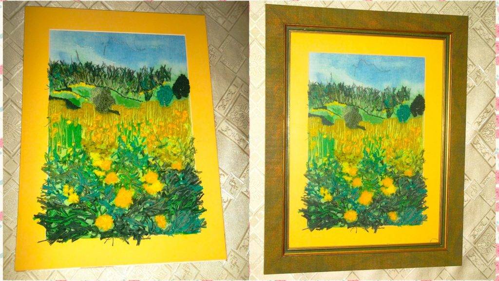 Одуванчики спереди делаете также, как траву, «петлями» или приклейте помпоны, которые можно сделать вилкой. Если хотите вышить атласной ленточкой, то посмотрите мастер класс Татьяны Улановой. Последним шагом с изнанки все петельные стежки хорошо промазываете клеем, чтоб не распустился шов. Далее на лицевой стороне разрезаете крону деревьев, зелень, одуванчики.