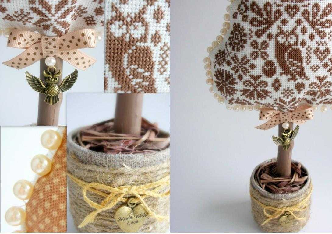 Заготовку, набитую синтепоном, не зашивайте полностью. Оставьте немного места в нижней части, чтобы в него вставить деревянный ствол, покрытый лаком. Разведите гипс с водой в равных пропорциях и залейте в приготовленное кашпо. Вставьте в него деревянную палку, на которую предварительно была установлена синтепоновая подушечка. В дополнение ко всему, готовую поделку можно еще украсить подвесками и бантиками.