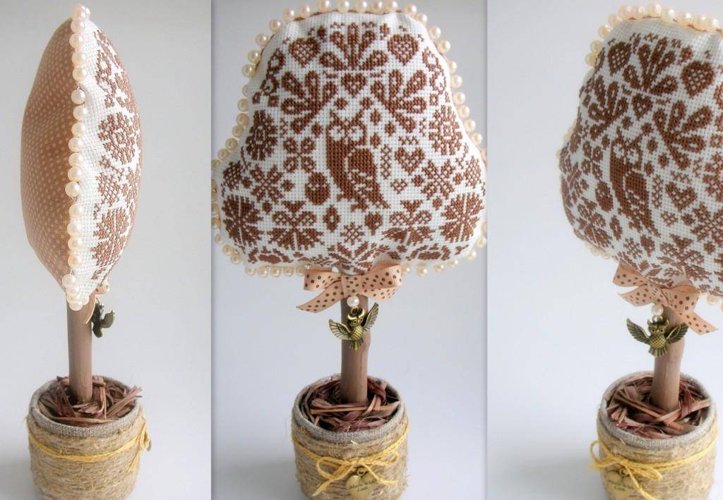 Вышитое полотно нужно приложить «лицом» к кусочку американского хлопка и аккуратно прошить так, чтобы получилась своеобразная «подушечка» по форме напоминающая крону дерева. Вывернув эту «подушечку», вы сможете набить ее синтепоном и украсить по краям бусинами, бисером, кружевом или органзой.