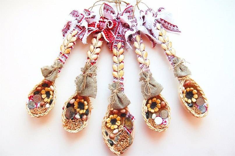 Ручку сувенира украшают миниатюрными подковами, монетами. Эти магические символы денежной мощи и удачи повышают действенность оберега. Самоцветы, гравировка тоже увеличивают внутреннюю мощь ложечки. Мистики советуют алые камни или породы, приманивающие деньги (хризолит, хризоберилл).