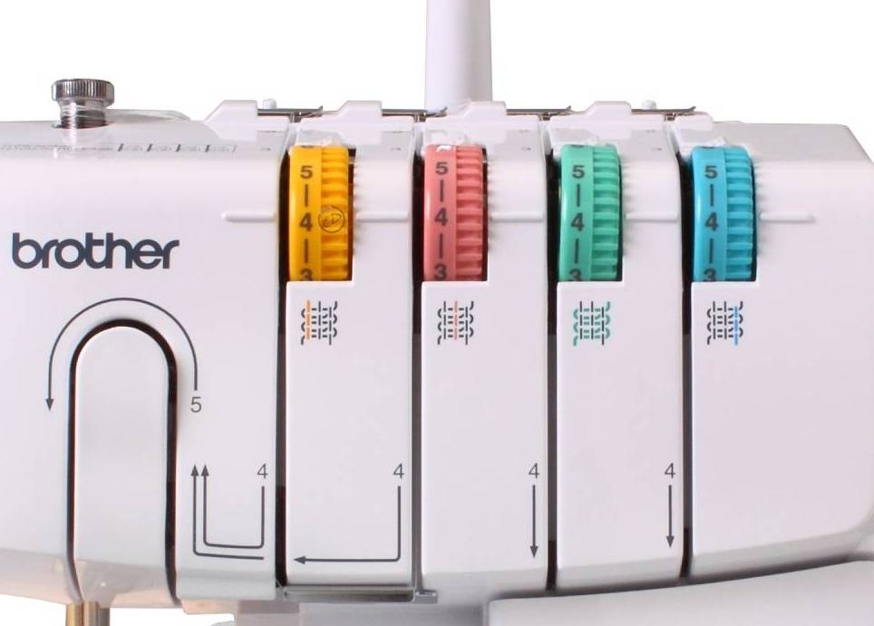 Рассмотрим настройку современного оверлока, имеющего 4 регулятора, каждый из которых отвечает за свою нить и выкрашен в определенный цвет:
