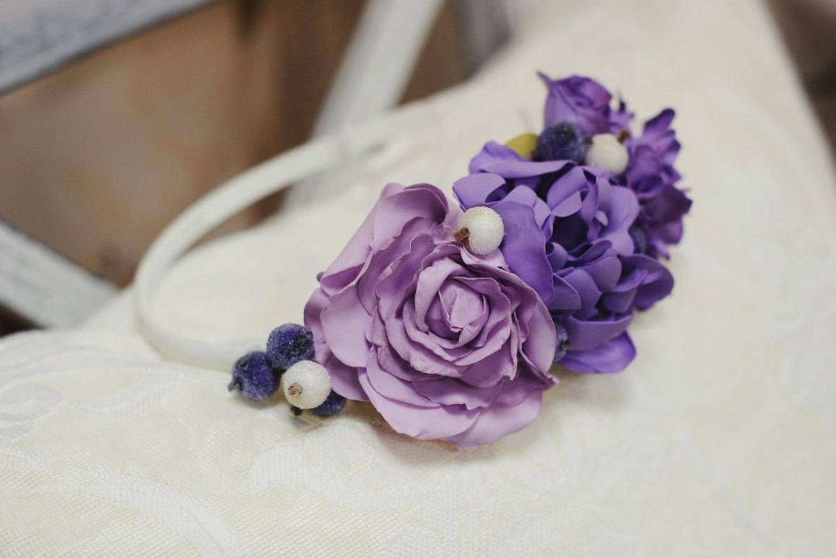 Для изготовления ободка нужно предварительно подготовить цветочки из фоамирана, а также засахаренные ягодки, используя для этого полимерную глину, клей, сахар и проволоку. Из полимерной глины нужно сделать различные по форме ягодки и надеть их на тонкую проволоку. Для большей прочности изделия нужно запечь в духовке, а затем покрыть их клеем и окунуть в сахар.