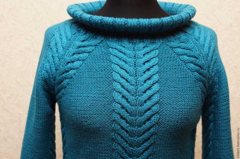 Воротник гольф для свободного пуловера с косами вяжут резинкой, используя прием «ложная кеттлевка». Описание основного узора: