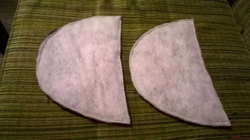 - Изготовить подошву. Поролон и войлок скрепить клеем и после высыхания закрыть эту внутреннюю часть с двух сторон тканью. Можно закрепить эти детали швом или скрепить наметочной строчкой.
