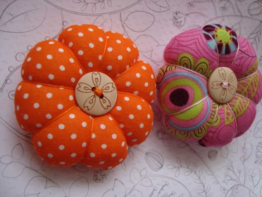 Внешний вид круглой игольницы можно варьировать. Изделию без картонной основы можно придать форму тыковки или стилизованного цветочками при помощи дополнительных декоративных стежков.