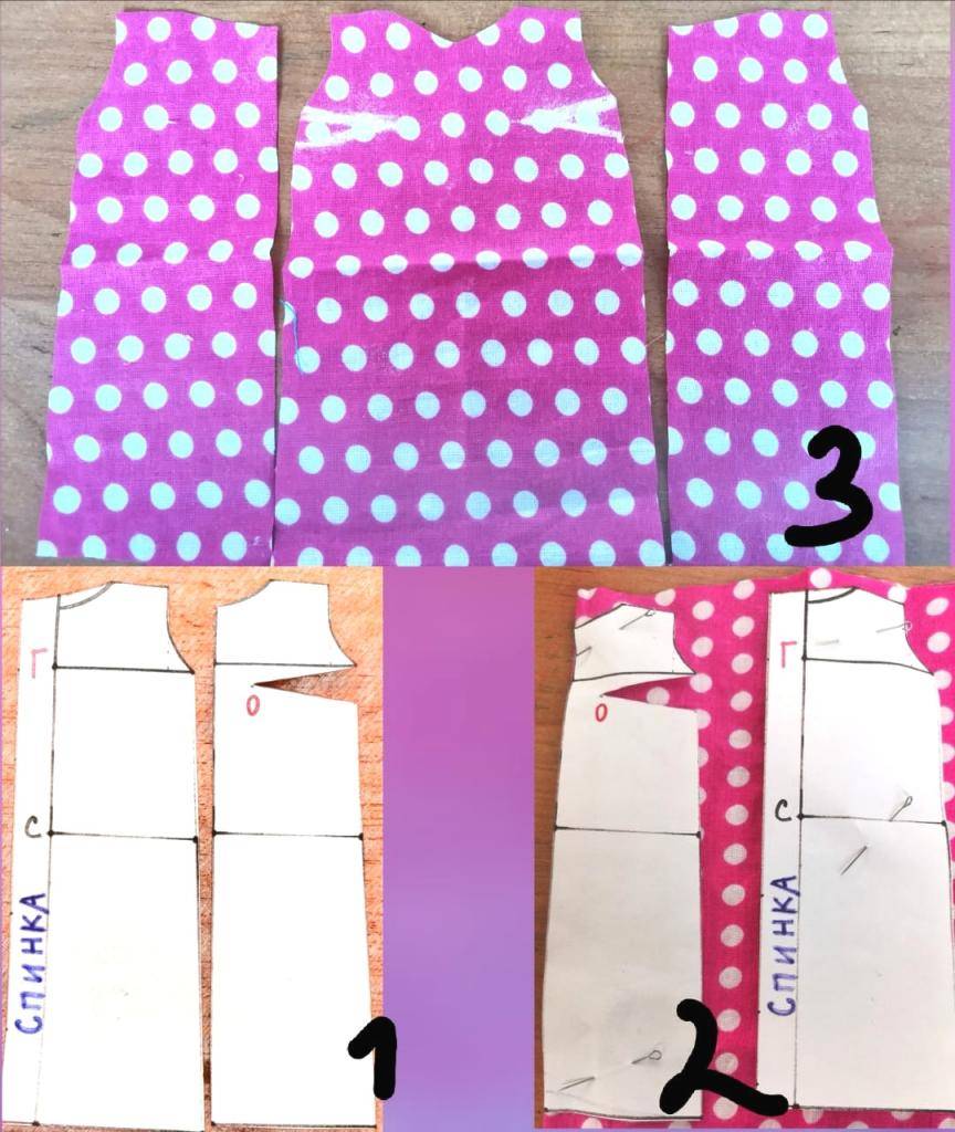 2. Прикалываем их булавками к ткани. При этом для детали переда ткань должна быть сложена вдвойне (цифра 2), и аккуратно вырезана (цифра 3).
